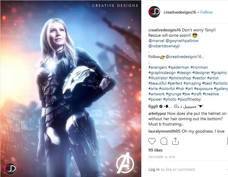 Một fan hâm mộ Avengers: Endgame đã vẽ bức tranh đồ họa Pepper Potts (Gwyneth Paltrow) trong bộ đồ mới đang sẵn sàng giải cứu Tony Stark / Iron Man (Robert Downey Jr.) khỏi không gian.